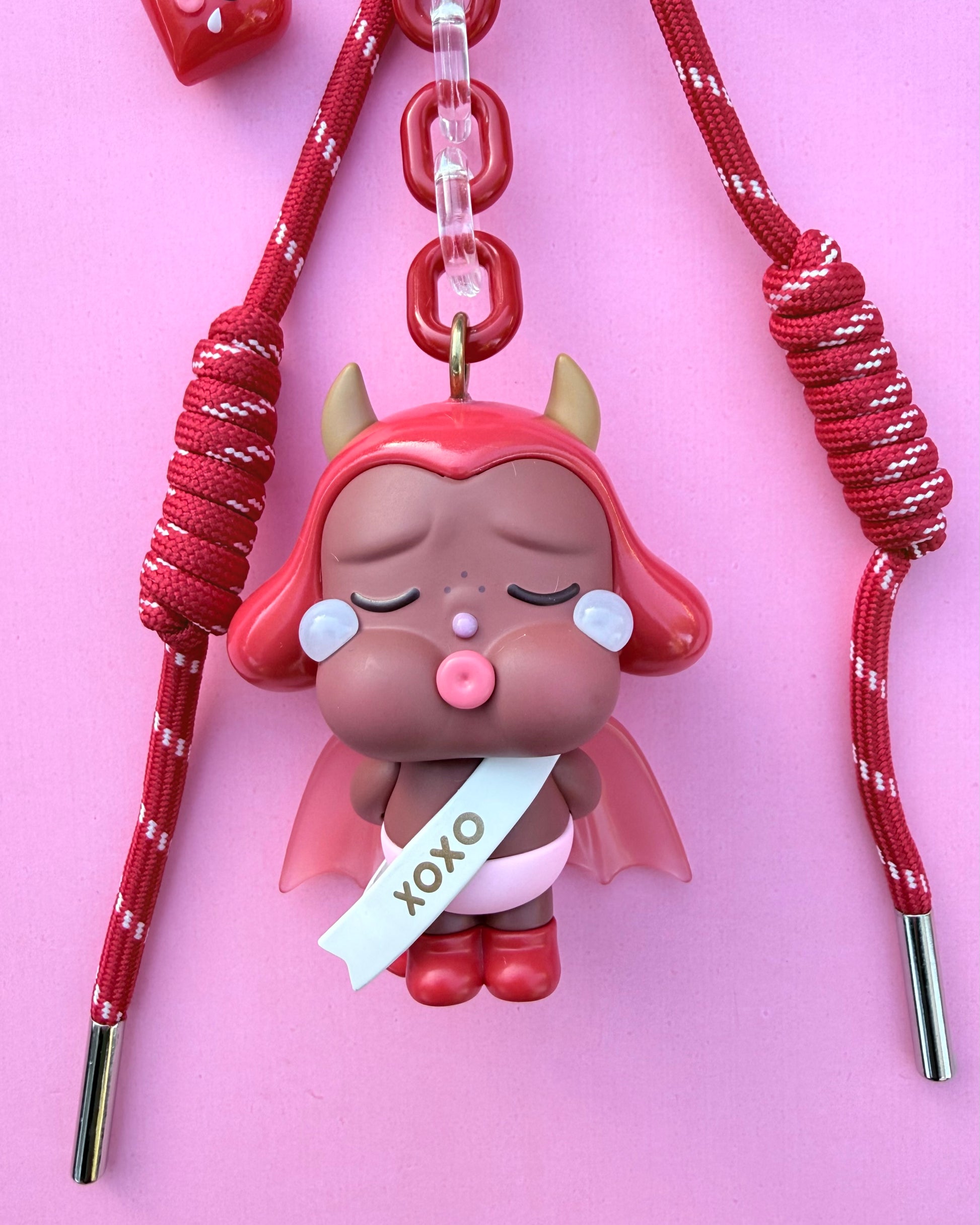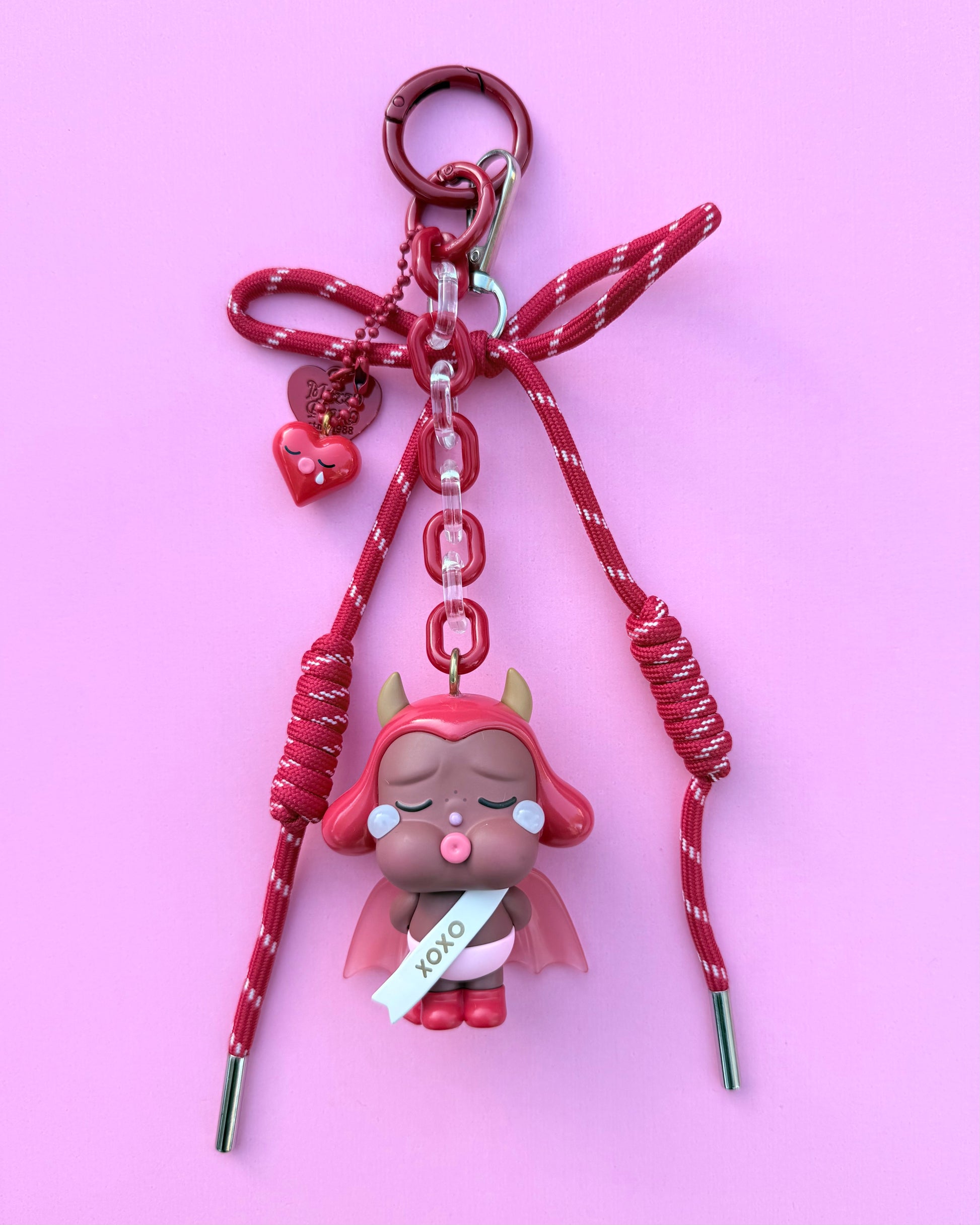 One-of-a-kind handcrafted charm to sweeten and embellish the look of your phone or bag. Includes Pop Mart Crying for Love figure, bow paracord, and additional embellishments, as well as an O ring clasp.