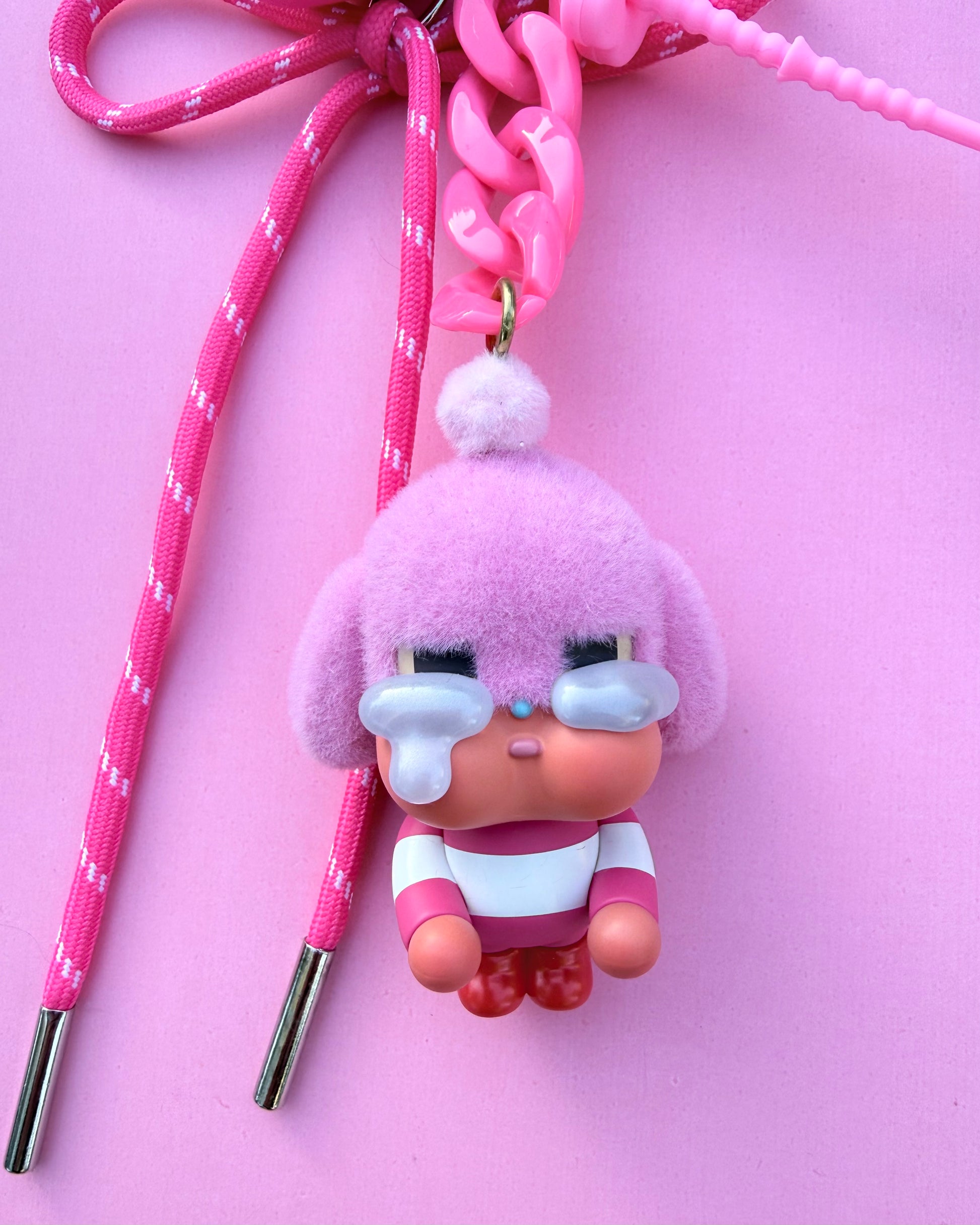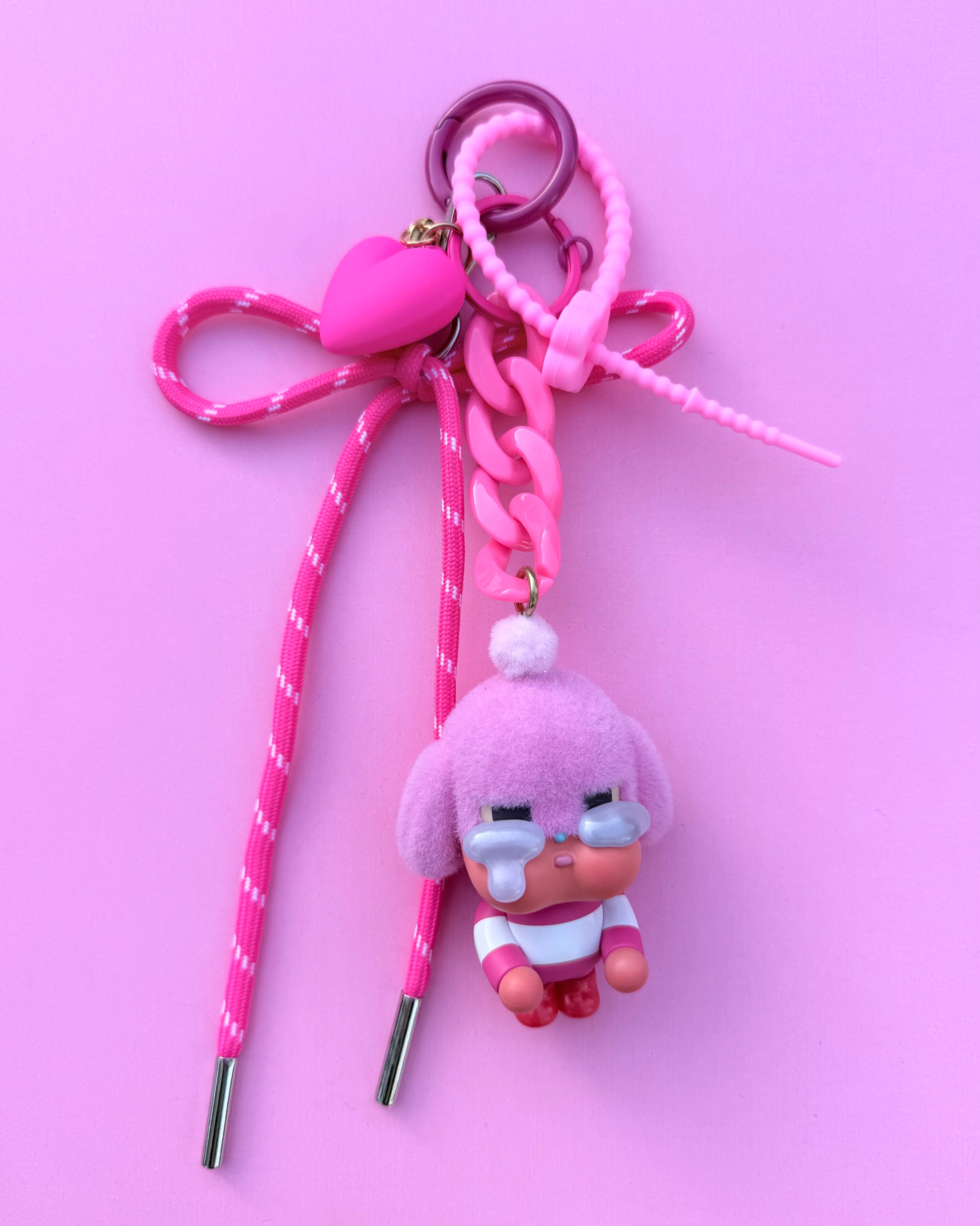 One-of-a-kind handcrafted charm to sweeten and embellish the look of your phone or bag. Includes Pop Mart Crying for Love figure, bow paracord, and additional embellishments, as well as an O ring clasp.