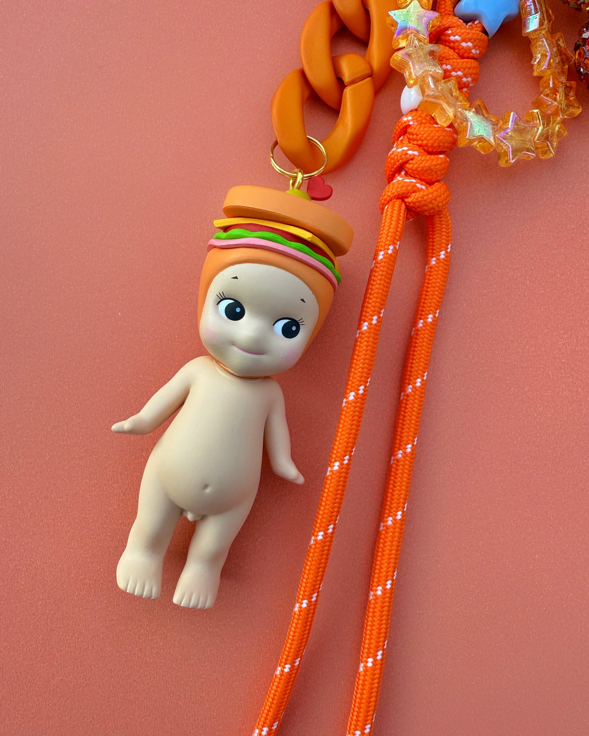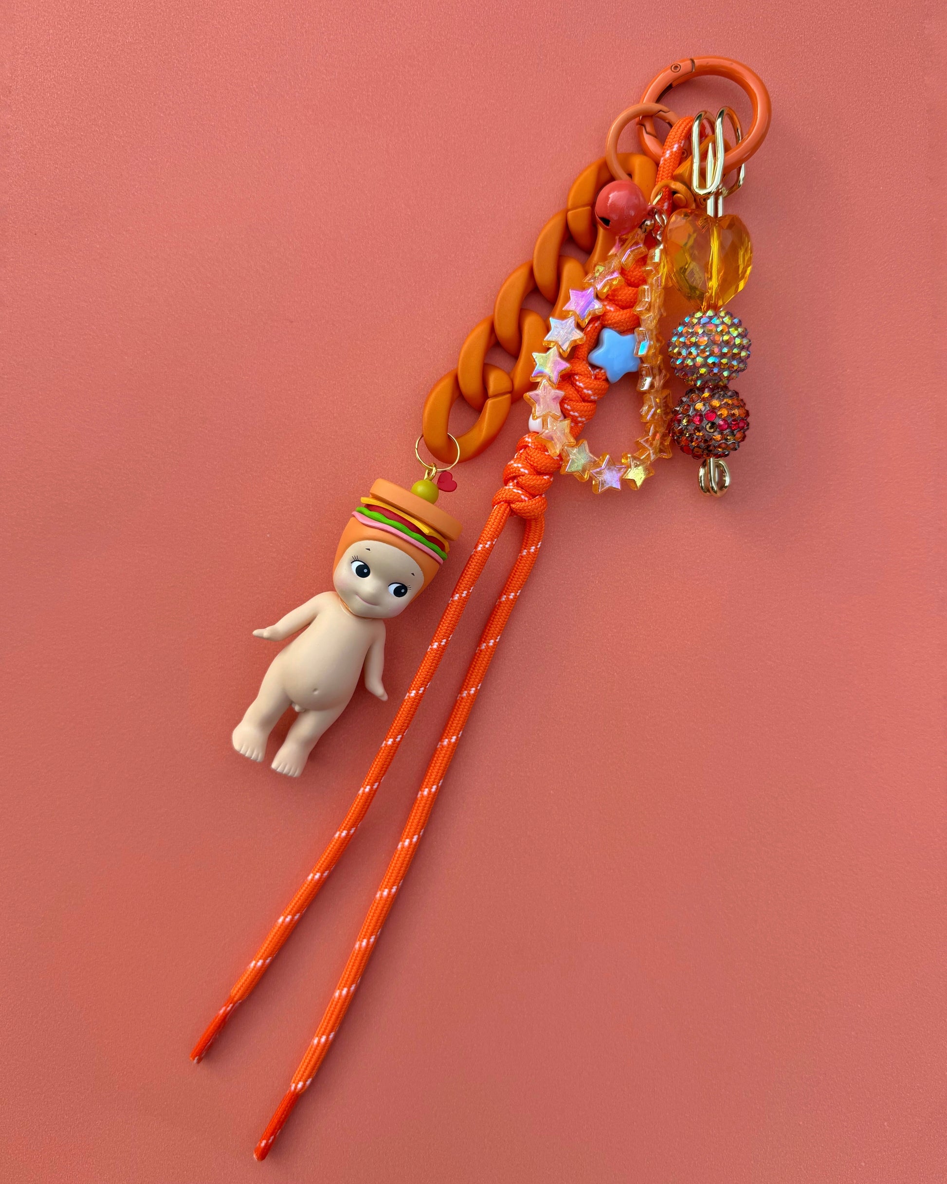 One-of-a-kind handcrafted charm to sweeten and embellish the look of your phone or bag. Includes Snack Series Sonny Angel, paracord, additional charms, and an O ring clasp.